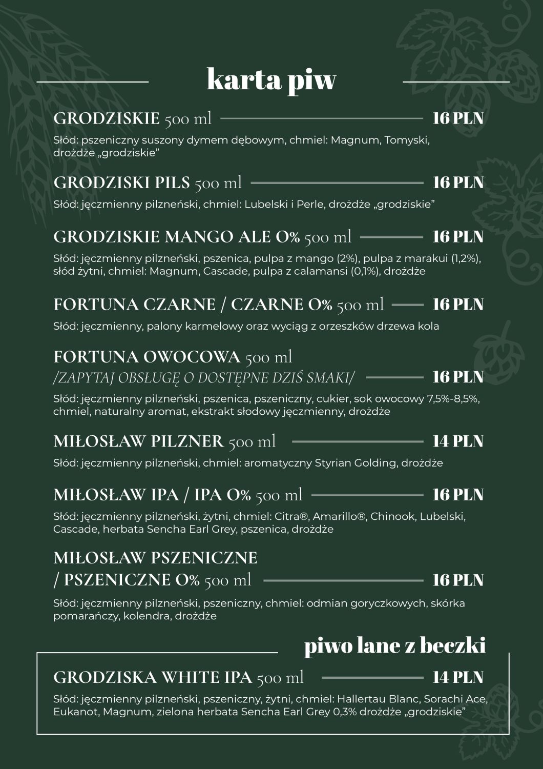 Nazywane niegdyś „szampanem wśród piw”, dziś wraca w swojej najlepszej formie. Lekkie, naturalnie musujące, z subtelną nutą dymu z ogniska – zawdzięcza swój wyjątkowy charakter słodowi pszenicznemu suszonemu dymem z drewna dębowego. Warzone zgodnie z oryginalną recepturą na wodzie grodziskiej i lokalnych drożdżach, refermentowane w butelce, dzięki czemu zachwyca klarownością i wysokim nasyceniem. Piwo Grodziskie to klasyka z duszą – idealne jako aperitif, do dań regionalnych lub po prostu do wzniesienia wyjątkowego toastu.